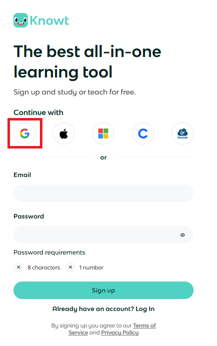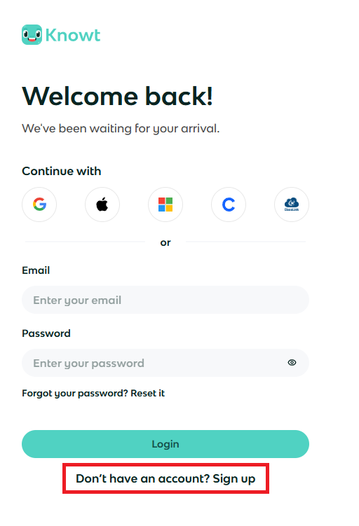 3. When the Knowt window opens, click on Don't have an account? Sign up. If you have already created an account, you can click the Google icon and log in.