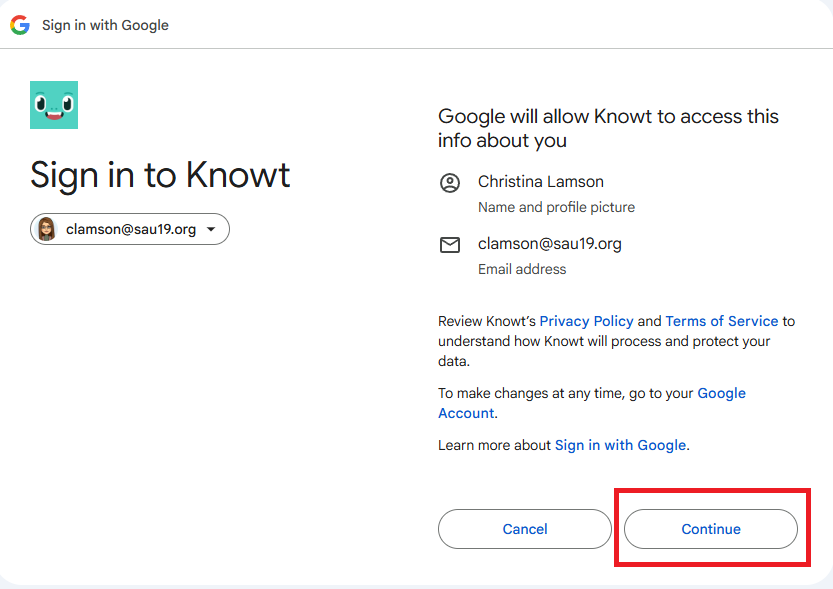 5. It will state that Google will allow Knowt to access your name and email address. Click Continue.