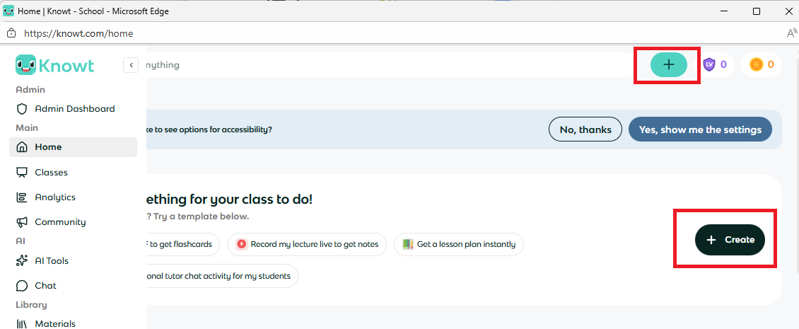 2. Select whether you want to create Notes, Flashcards, or whether you want to import resources. Click the links below to access more information on create various resources on Knowt.