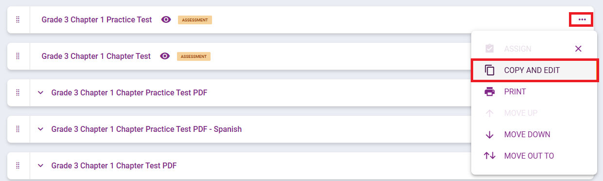3. Once an assessment has been selected, the teacher will click the 3-dots to the right of the assessment name and click Copy and Edit.