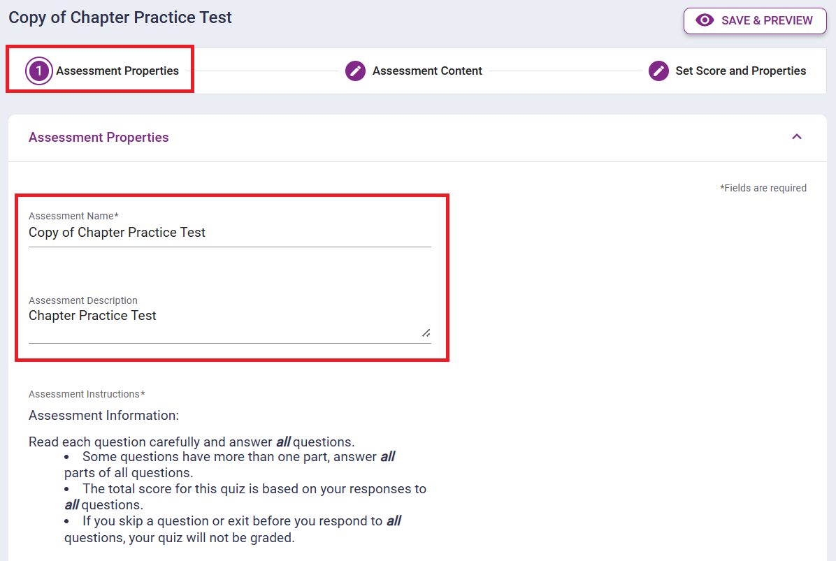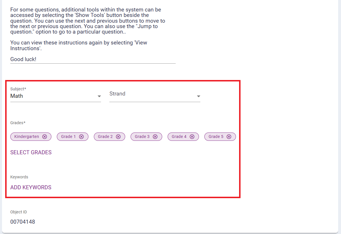 5. When the Copy of the assessment automatically opens, edit the Assessment Properties including the Assessment Name, Assessment Description, Subject, Strand, Grade, and Keywords.