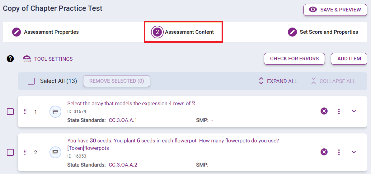 6. Click the Assessment Content tab and view, add, rearrange, and/or remove items from the assessment.