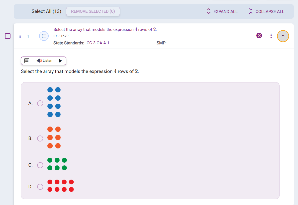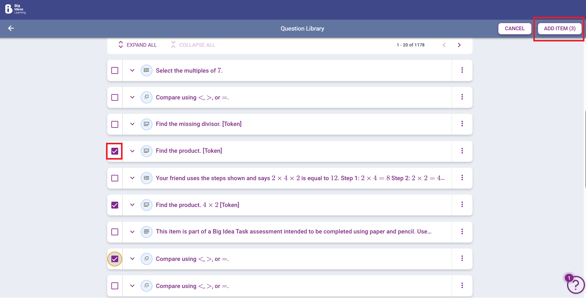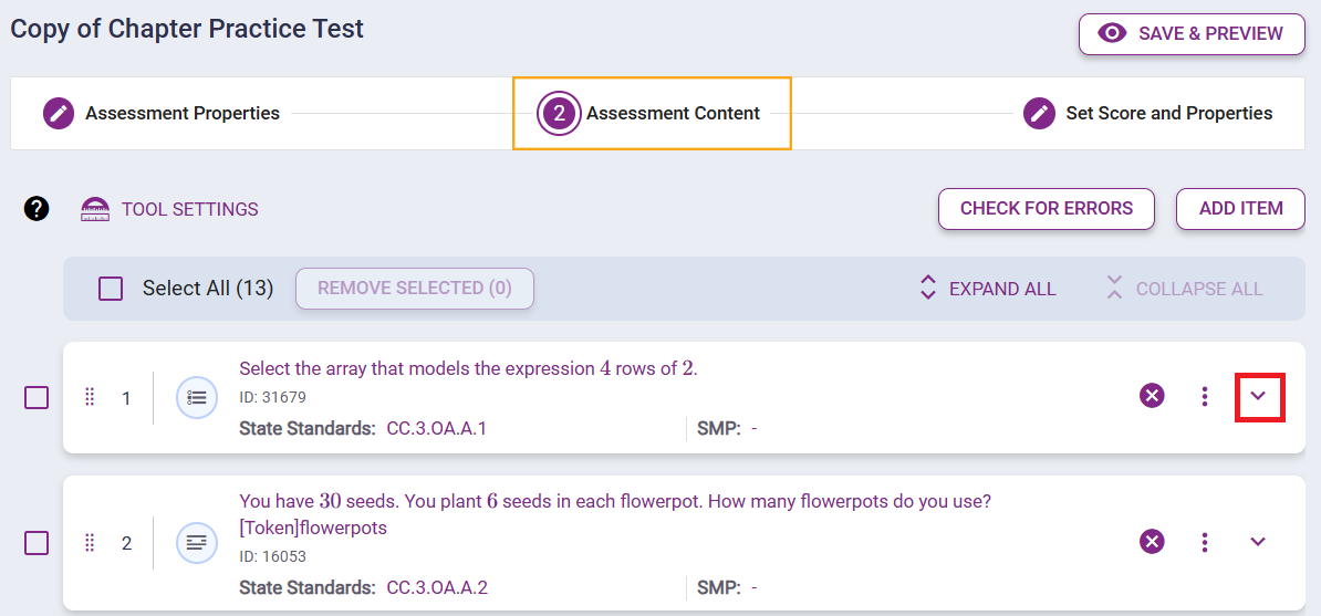 Similar to Previewing and Editing the existing assessment, the Question bank allows you to expand, view, and check the questions to be added to the assessments. Multiple questions can be selected at one time by checking all the boxes next to the questions you want to add. You can adjust the search by selecting MORE FILTERS, to narrow down items by Grade, difficulty level, and other characteristics. Once you have checked all items to add to the Assessment, click Add Item.