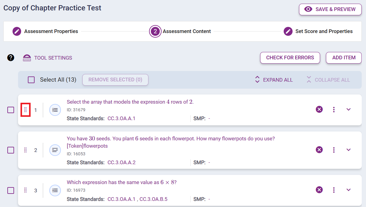 Hover over the array of 8 dots to the left of an Assessment item that you want to move. Then click and drag it to the desired placement in the Assessment.