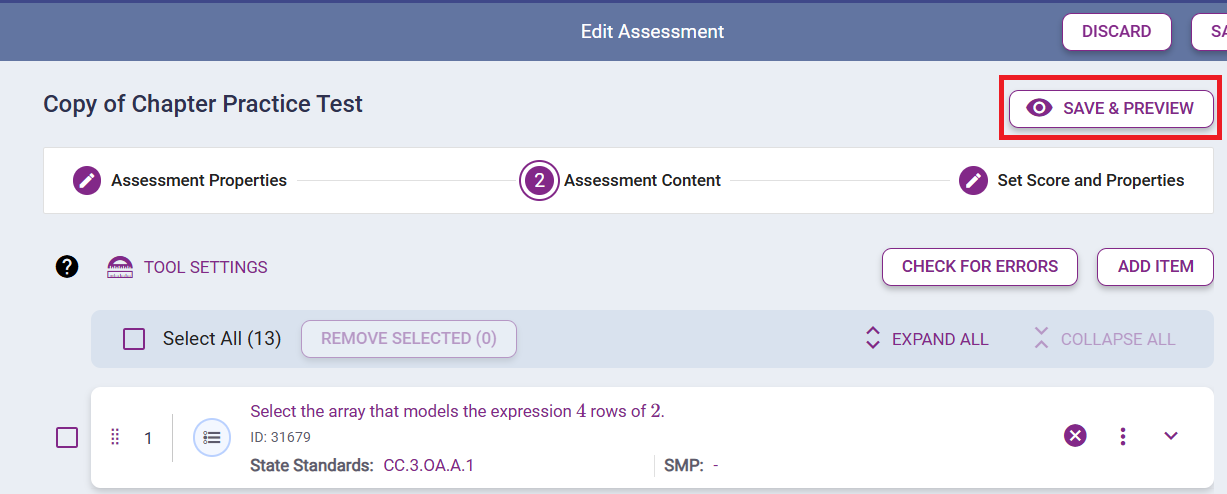 9. Once all edits are made, click SAVE AS DRAFT to save the customized assessment as a draft (a draft cannot be assigned) or SAVE & PUBLISH to save the assessment in a form that makes it available to assign. Students won't be able to see the assessment unless it is assigned. When the assessment is saved, it will appear within the PLAN view below the original assessment that it was copied from.
