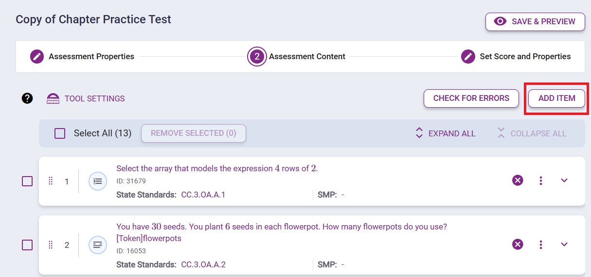 Click ADD Item. Then you can search for items either by Standards or Course, Chapter and Lesson.
