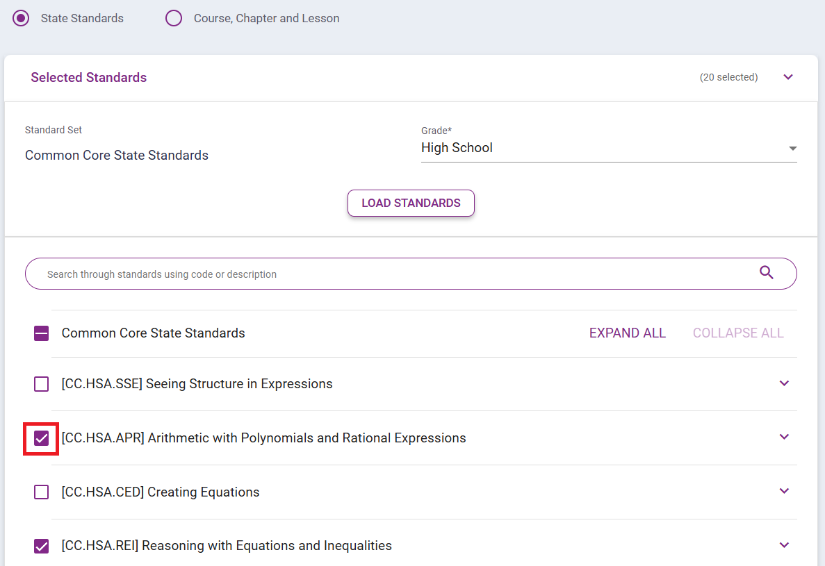 Click the State Standards circle. Check the Standards and Grade level. If it is incorrect, select a new Grade from the drop-down menu. Click LOAD STANDARDS.