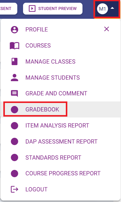1. Click on your profile icon in the top right corner (circle with your initials) and then click ITEM ANALYSIS REPORT from the drop-down menu.