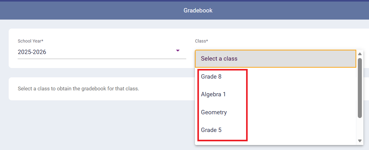 2. Click the Class drop-down menu to select a class to generate a Gradebook report for.