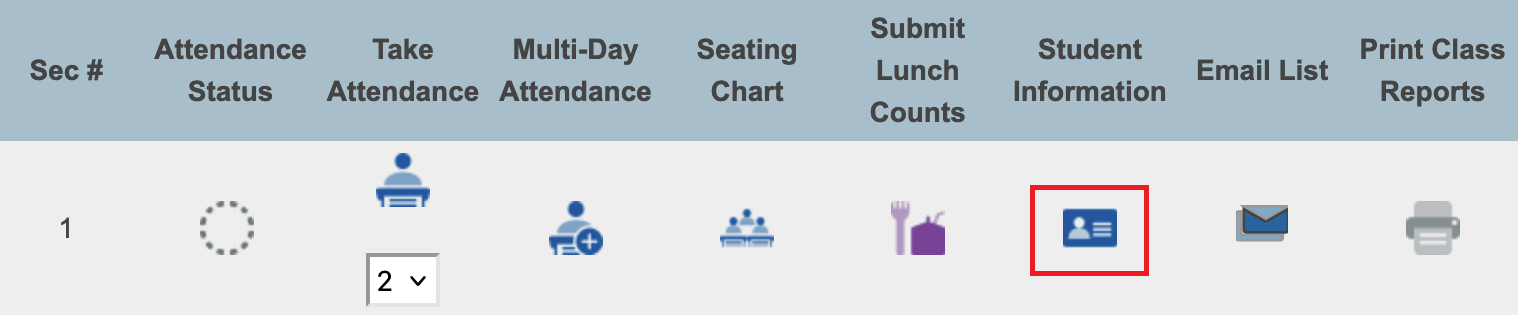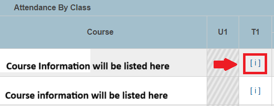 1. The first page should be the Grades and Attendance screen (if not, click on the Grades and Attendance tab), you will see an (i) in any Trimester column that has assignments and standards added.