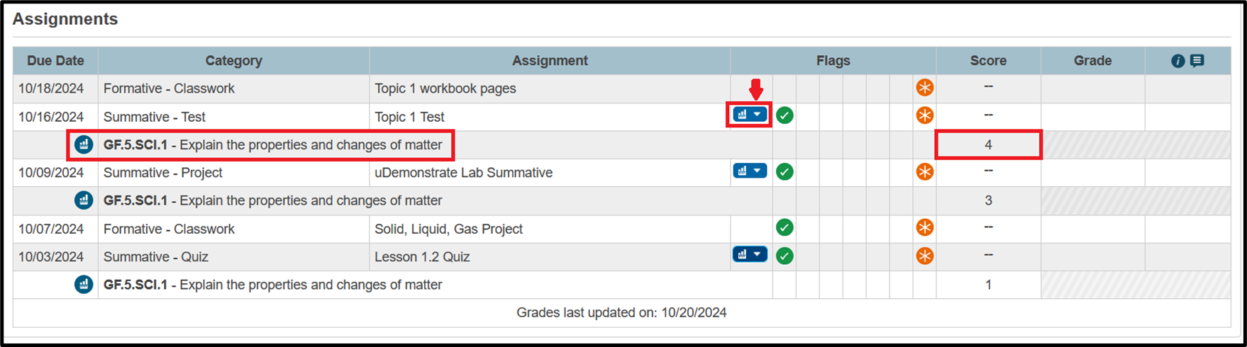 4. To view standards information and scores, click the drop-down arrow on the blue graph icons. You will now be able to see all the standards attached to assignments, as well as any scores received.