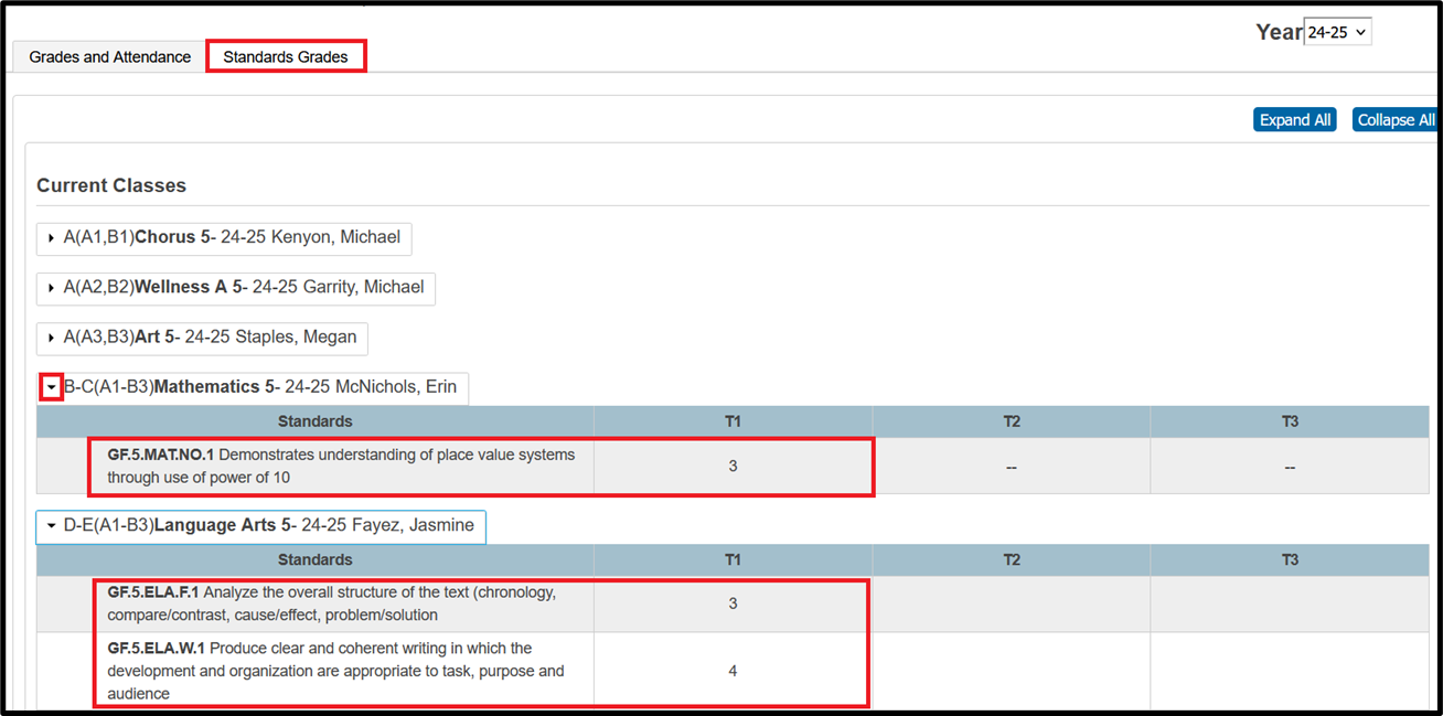 2. Click the drop-down arrow for the class(es) you want to view the standards scores for. You will see any standards that have been scored to that point and the calculated score that has been received.