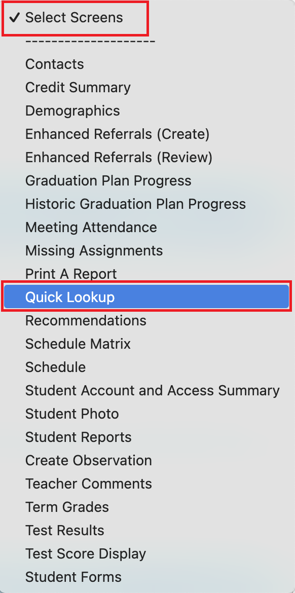4. If will load your default screen. If this screen is not the Quick Lookup page, then click on the Select Screens drop-down menu in the right and select Quick Lookup.