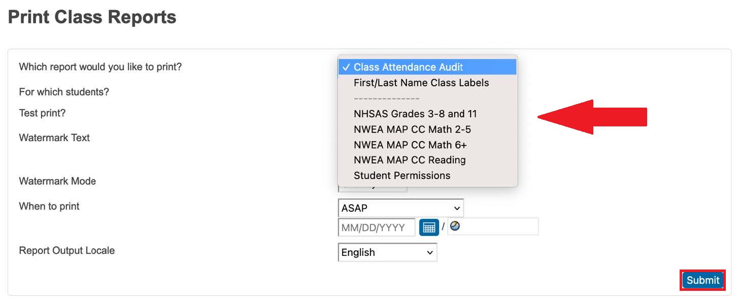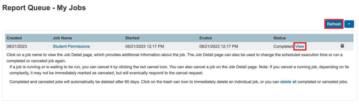The Report Queue will list jobs with the most recent at the top. Reports can be deleted by clicking