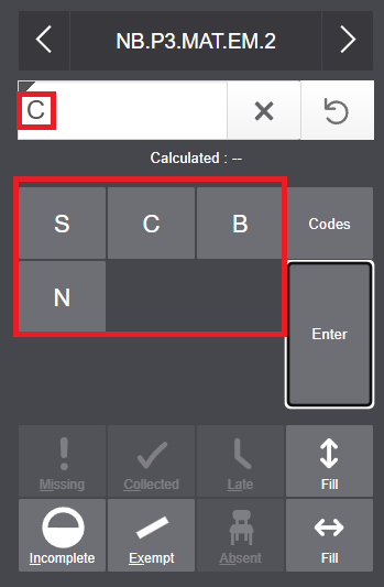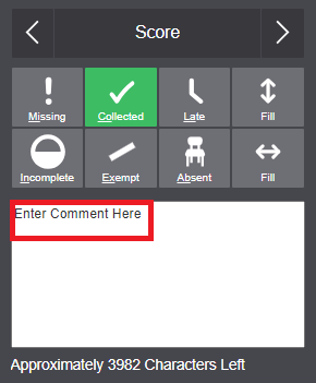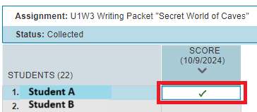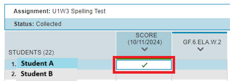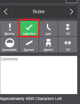 2. Click into a cell in the Score column and click the Collected flag in the Score Inspector. You can also enter other flags here such as Missing, Late, Incomplete, Exempt, and Absent.