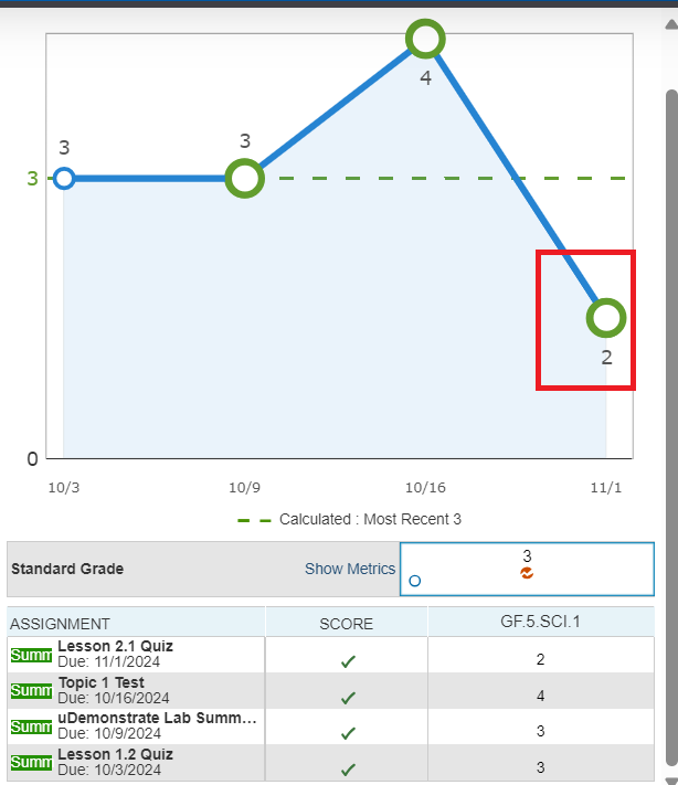4. Review the scores that are calculated for all students on each standard. These are calculated by the last 3 scores given on Summative assignments for that standard. If less than 3 scores were entered, it will calculate the average of the one or two scores entered.