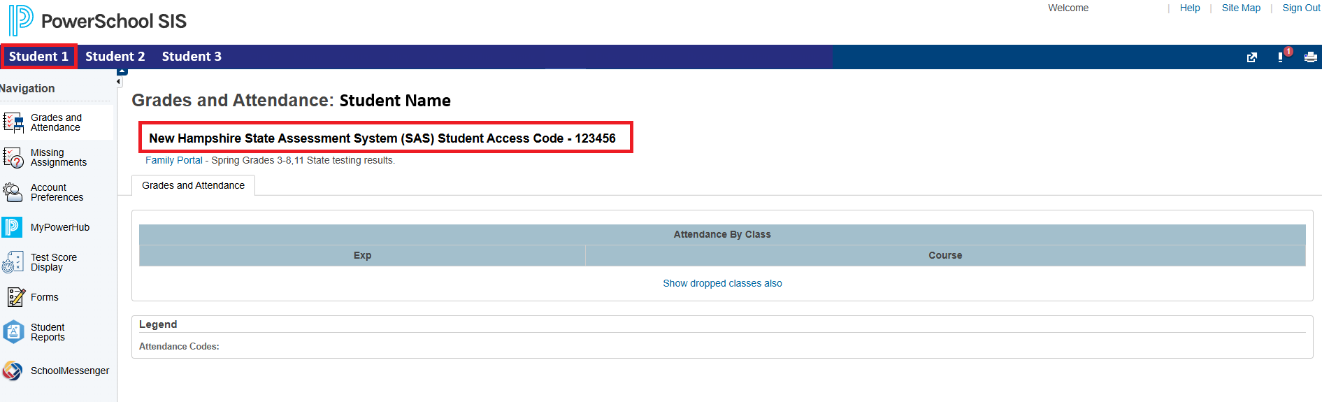 In order to view your child's New Hampshire State Assessment System (SAS) scores, you will first need their SAS student access code to log into the family portal. This code is located in your PowerSchool parent account. Please note that every eligible student has their own unique access code. To locate your student's SAS access code, please follow these instructions: