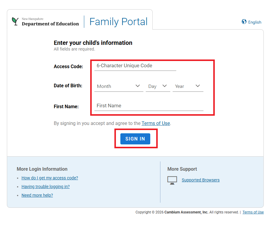 5. Click on the Family Portal link: https://nh-familyportal.cambiumast.com/#/ and enter your child's Access Code, Date of Birth, and First Name. Then click Sign In.