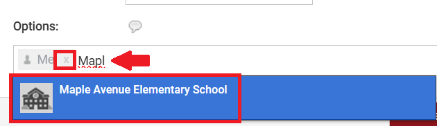 6. In the text field below Options you will see the word Me with a silhouette of a person. That represents your Personal Schoology Calendar. Click the X next to Me to remove it from your personal Calendar. Then start typing in the name of your school. Once it pre-populates, click on your school.