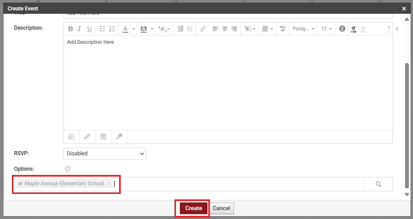 7. You will now see only the school's name in this field. Click Create to add the event to the school Calendar in Schoology.