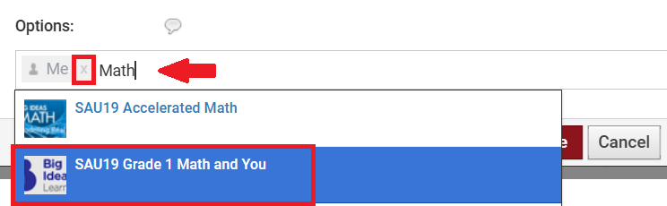 6. In the text field below Options you will see the word Me with a silhouette of a person. That represents your Personal Schoology Calendar. Click the X next to Me to remove it from your personal Calendar. Then start typing in the name of your Course and/or Group. Once it pre-populates, click on it. You can add the event to multiple Courses and/or Groups at a time by typing in each Course/Group into the field and clicking on it when it prepopulates.
