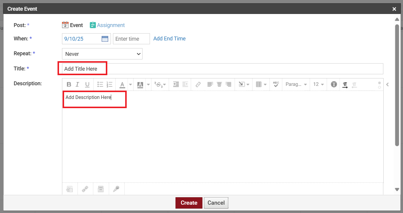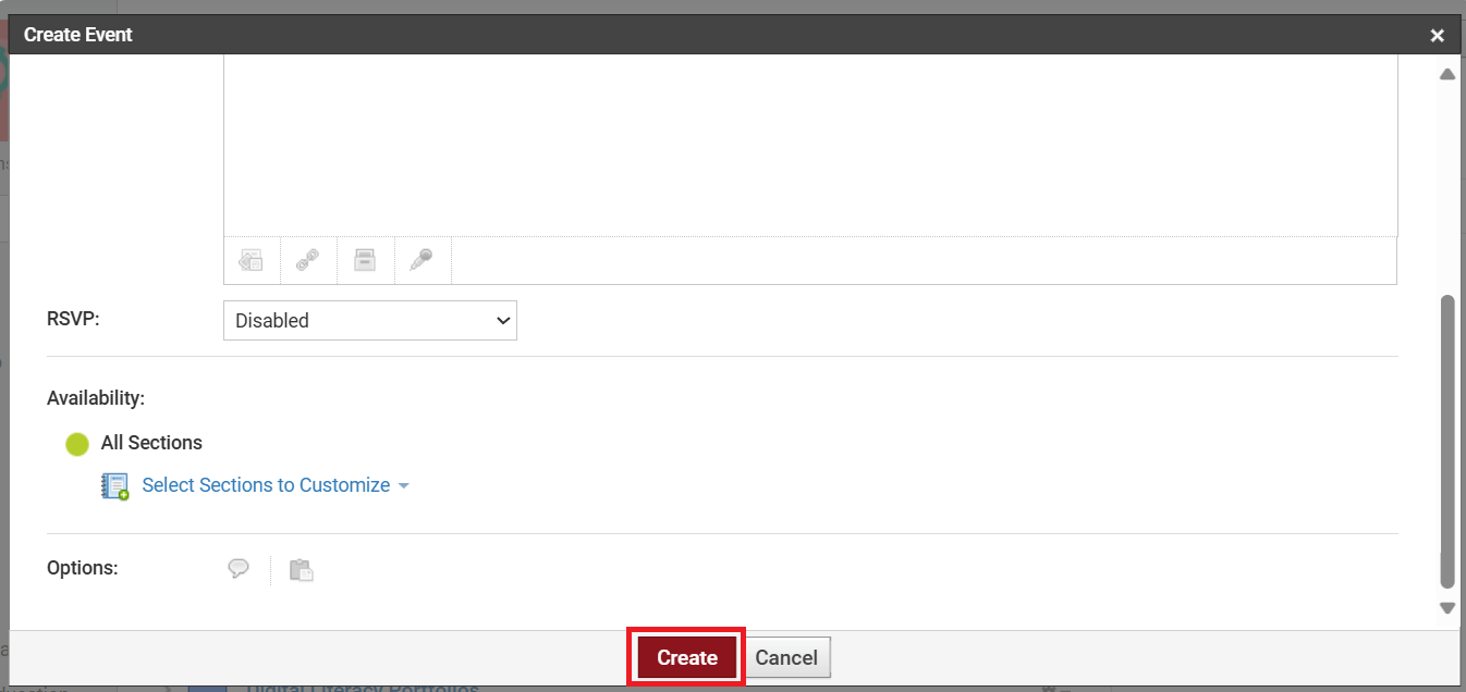 6. Click Create to add the event to that specific Course/Group Calendar.