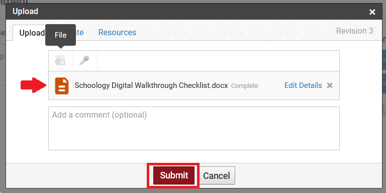 5. Once the file has uploaded, you will see it attached. Click Submit.