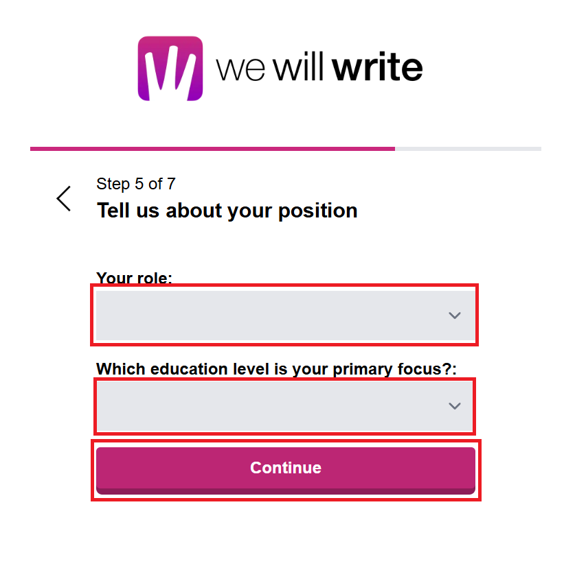 8. Select your role from the Your role drop-down menu and select your education level from the second drop-down menu. Then click Continue.