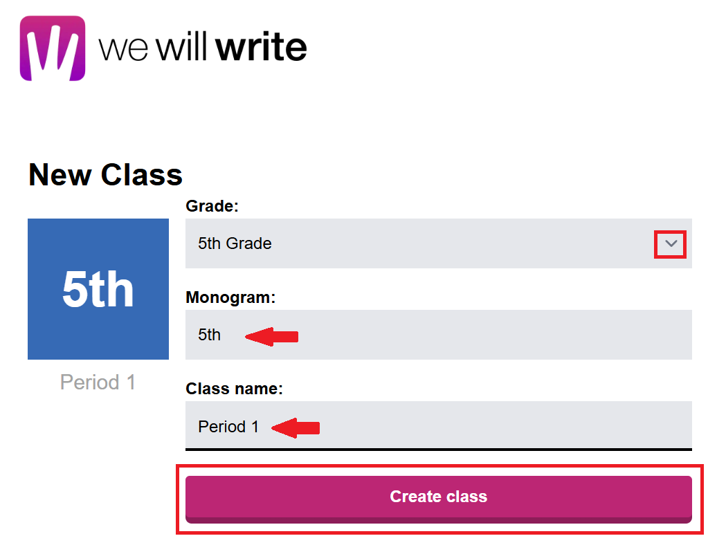 11. Select a Grade from the Grade drop-down menu. Type what you want to show in the Monogram box, and type in a name for the class. Then click Create class.