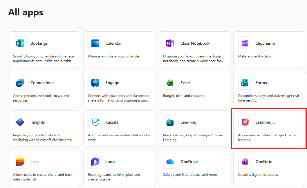 - Built directly into Microsoft 365, Learning Activities appears in the Apps list, eliminating the need to switch between platforms or tools.