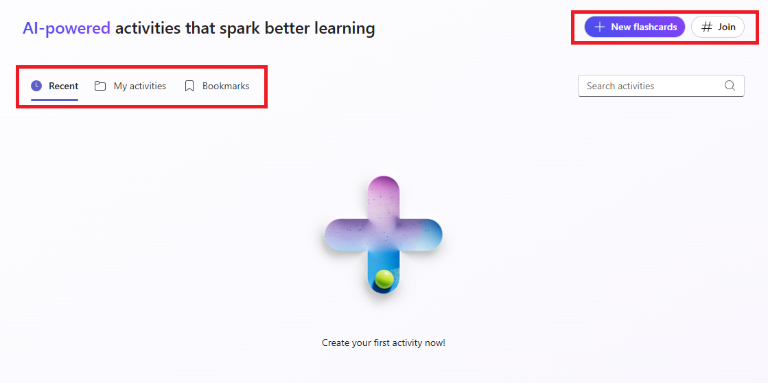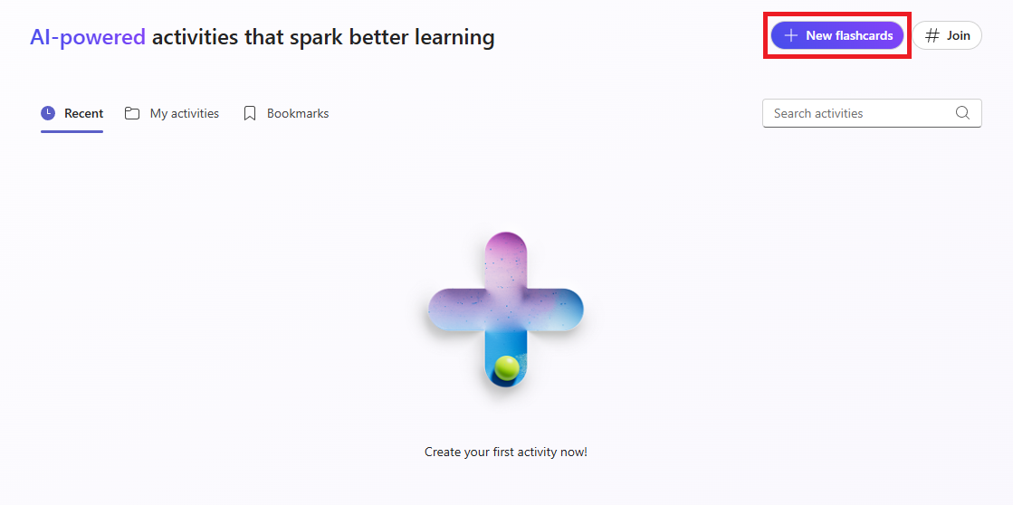 On the main landing page, you will be able to navigate to Recent (access any flashcards you recently created), My activities (access all flashcards that you have created), and Bookmarks (quickly access any flashcards that you have bookmarked). On the right-hand side you can click on + New flashcards to begin creating flashcards or # Join to view flashcards that were created.
