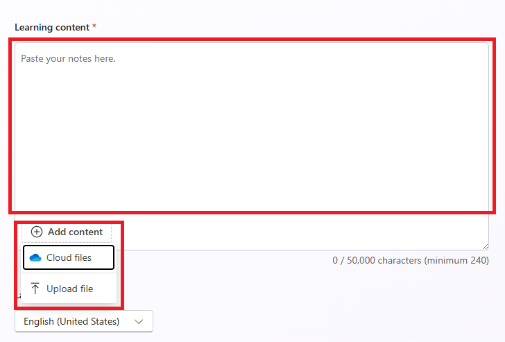 5. You can copy and paste content to use for your flashcards into the text box, or you can click Add content, select Cloud files or Upload file and select the files you want to use. You can upload files such as syllabi, lesson notes, chapter summaries, word lists, transcripts, etc.