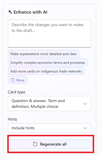 10. On the right of the list is an AI enhancement tool. Use this to help change information you want to adjust on the flashcards and then click Regenerate all.