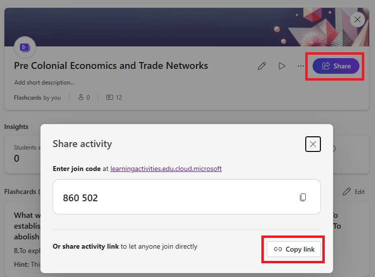 14. To share the flashcards with students, click the Share button and then click Copy link. This will create a direct link to the activity for students. Paste this link into your Schoology Course for students to access.