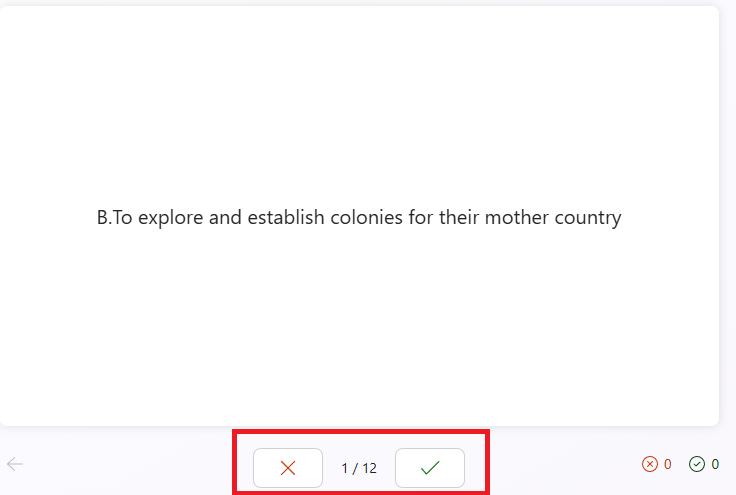 To answer a flashcard, you can interact with it by clicking on the answer you believe is correct. It will show you the answer you selected. To confirm your selection, click the green checkmark. To choose another selection, click on the red X, then select your new choice. If will let you know if your choice was correct or incorrect by flashing, I know this! or Still learning! on the screen and marking it on the right-hand side of the flashcards. Some flashcards will have a word on the front and the definition on the back. Click the flashcard to see the definition. You can click the checkmark or X to self-report if you knew it or not.