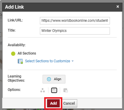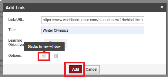 8. Click on the ABC icon to ensure the article will display in a new window. Then click Add.
