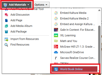 1. Within your Schoology course, navigate to the folder you want to embed the resource in and click on Add Materials. Then select World Book Online from the right side of the drop-down menu.