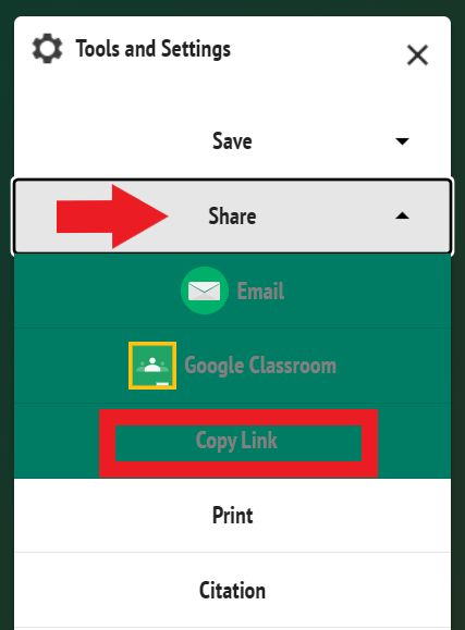 5. Select Share from the drop-down menu and then select Copy Link. If the link was copied correctly, you will receive a message saying the copying was a success.