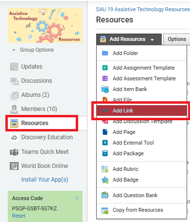 6. To add resources, select Resources. Choose Add Resources and select Add Link.