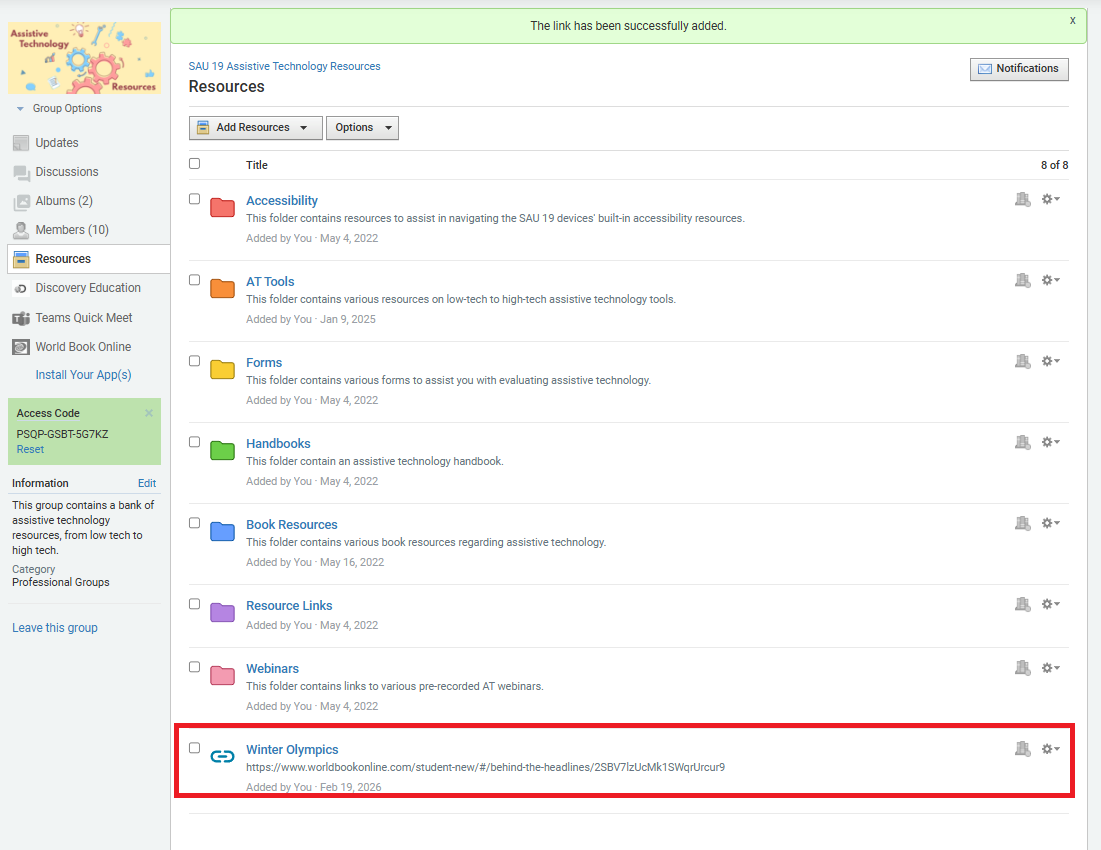 Group members will now see the link to the article you added as a resource within the Schoology Group.