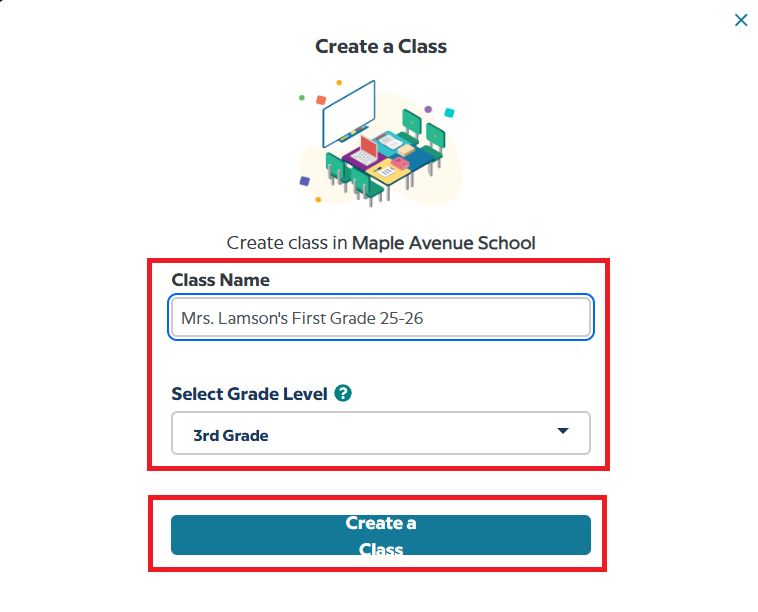 4. Enter a title for your class in the Class Name field. Please use the school year in the title so you can tell the difference between your classes in future years. Then select your grade from the Select Grade Level drop-down menu and click Create a Class.
