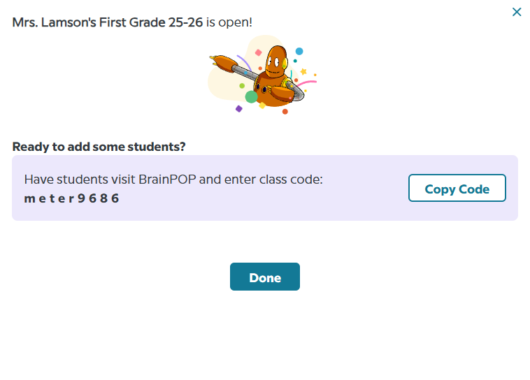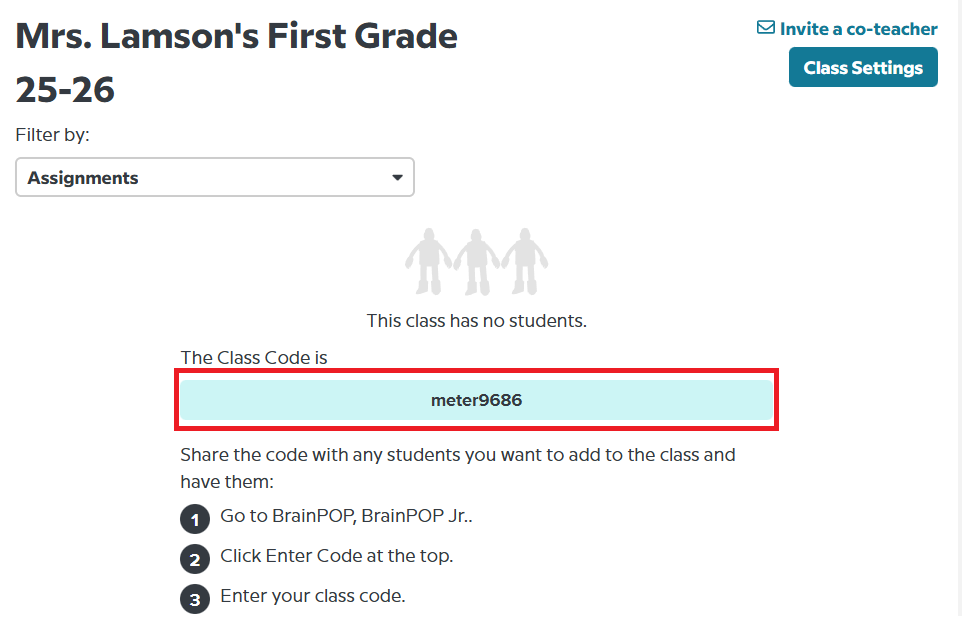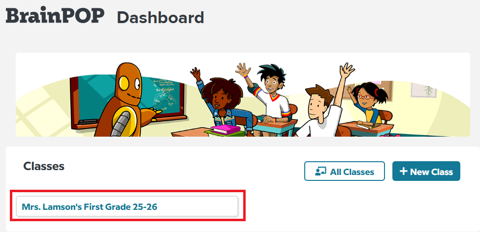 If you have forgotten the code, you can go back into your BrainPOP Dashboard and click on the class name. The code will be displayed on your class page.