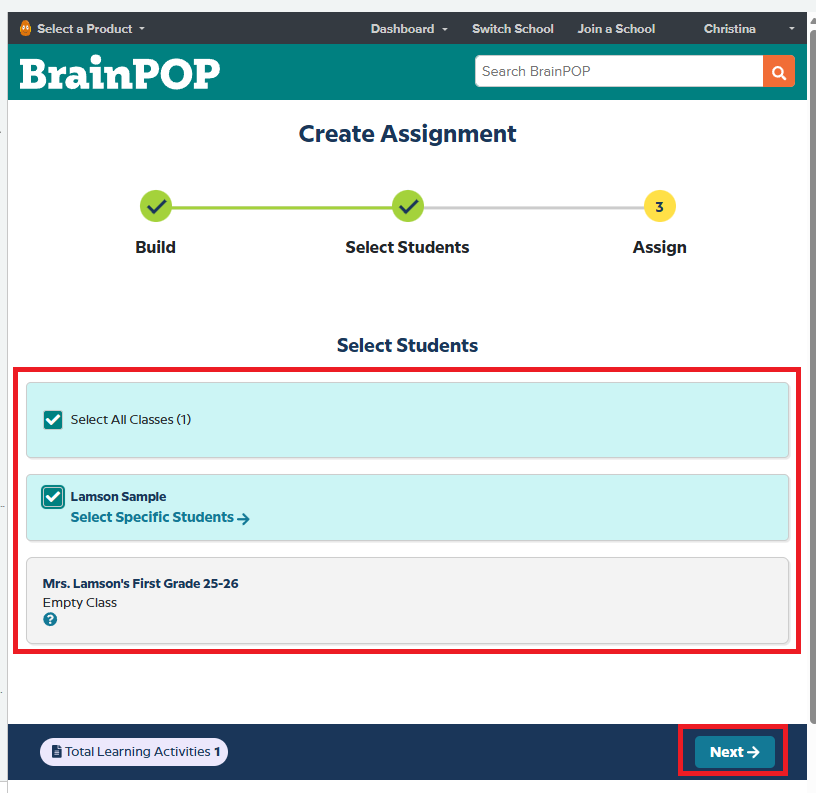 7. Select who to assign the resource to by checking the box next to the class and choosing all students or selecting specific students. Then click Next.