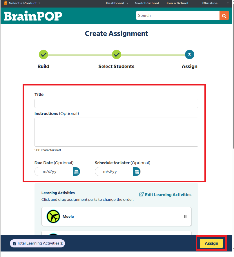 8. Enter a name for your assignment in the Title field. Enter information for the assignment in the Instructions (Optional) field and add a Due Date. Then click Assign.