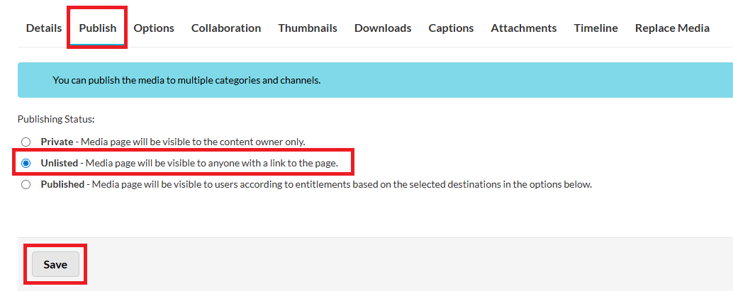 6. Click on the Publish tab and scroll to the Publishing Status: options. Click Unlisted and then click Save.