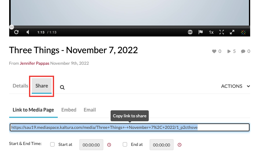 For YouTube Links, paste the link into the box, review the information that appears in the Preview, select 'Unlisted' for the publishing options, and then save. If you are grabbing a link to already saved media, you will need to edit, by clicking the pencil edit icon next to the video, clicking on the publish tab, select 'Unlisted', then save. Once you go back to the media, you can follow the steps below.
