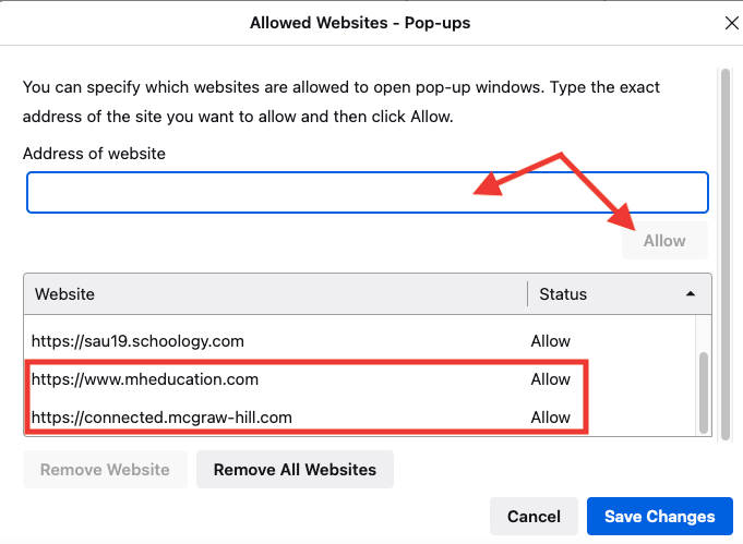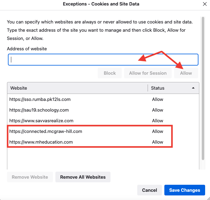 5. Enter the following websites one-by-one into the 'Address of website' field and click on 'Allow'. Once all websites are added, click on 'Save Changes'.