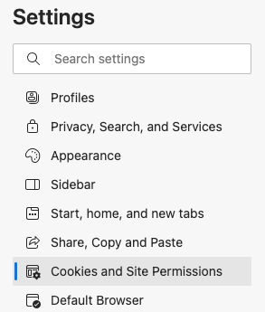 3. Click on 'Cookies and Site Permissions' from the left side bar.
