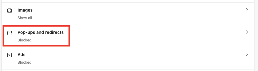 7. Go back to the 'Cookies and Site Permissions' page and scroll down until you see 'Pop-ups and redirects' and click on it.