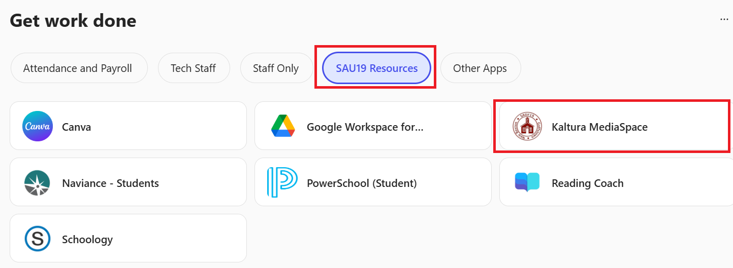 1. Log into Kaltura MediaSpace by logging into your Microsoft 365, scrolling down to the Get Work Done section, click on the SAU19 Resources tab, and clicking on Kaltura MediaSpace.